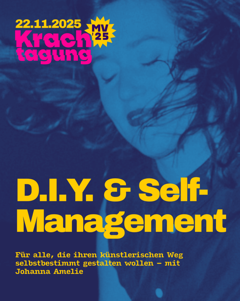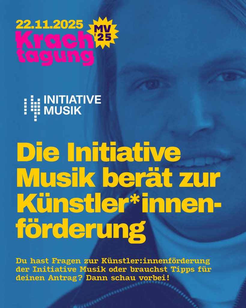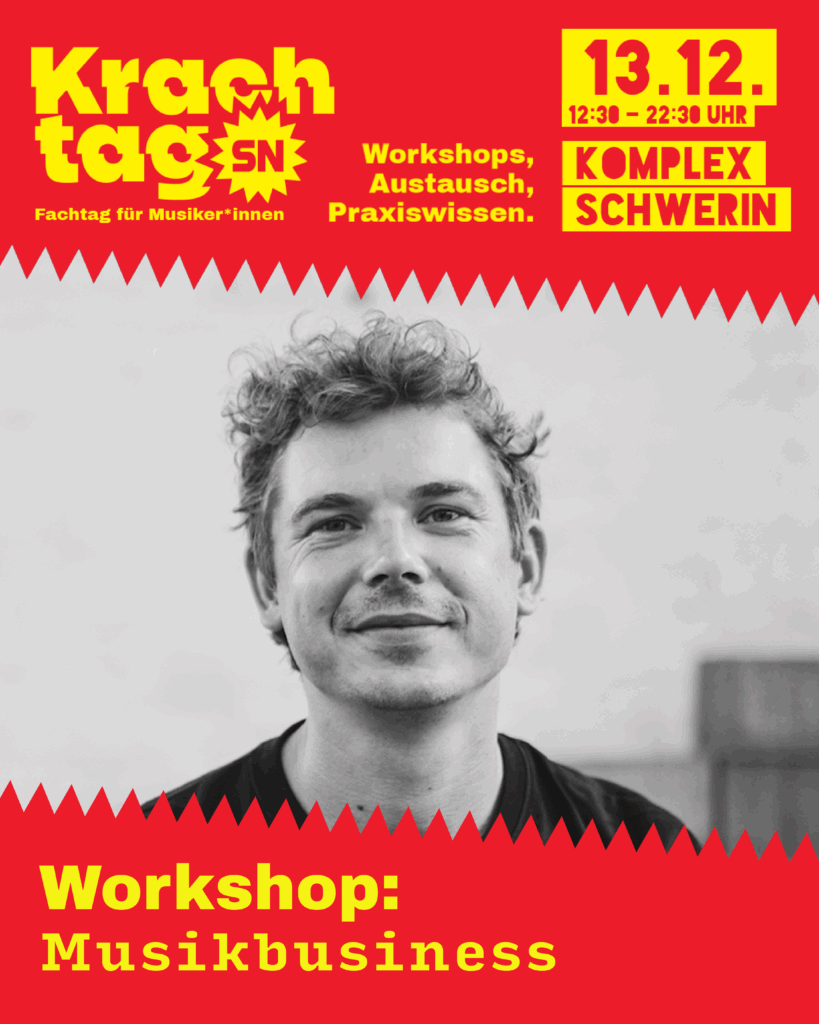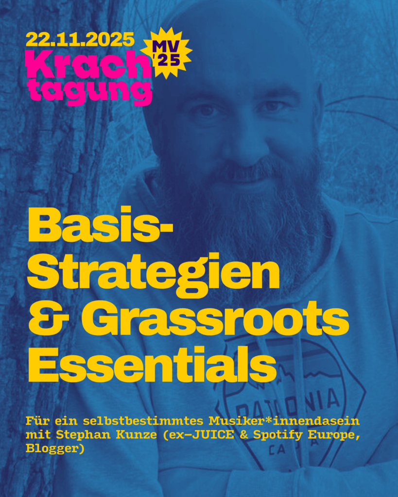 Am 22.11.25 haben wir einen Fachtag für Musiker*innen in der Greifswalder STRAZE organisiert. Von 11-18 Uhr gibt es 12 Workshops, einen Paneltalk und jede Menge Praxiswissen von erfahrenen Hochkarätern aus dem Musibusiness (Eintritt frei). Das komplette Programm inkl. Timetable und Inhalt: HIER