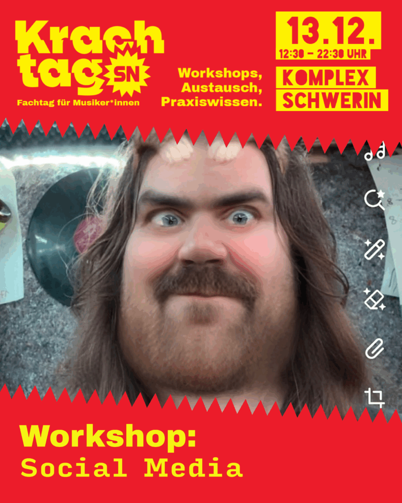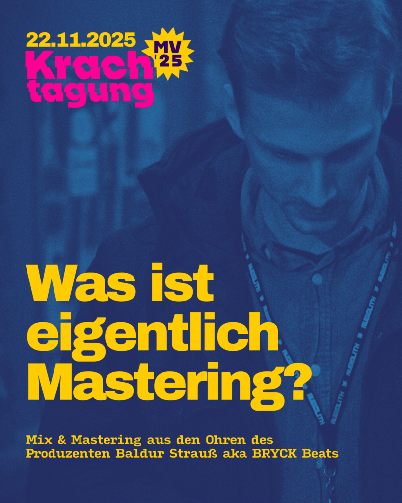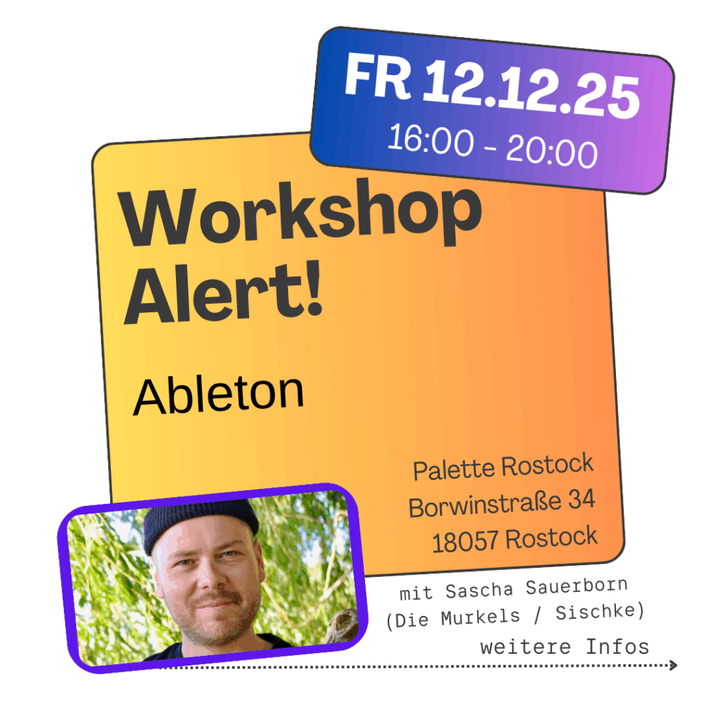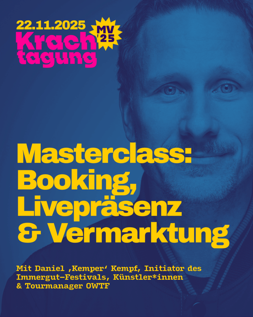 Am 22.11.25 haben wir einen Fachtag für Musiker*innen in der Greifswalder STRAZE organisiert. Von 11-18 Uhr gibt es 12 Workshops, einen Paneltalk und jede Menge Praxiswissen von erfahrenen Hochkarätern aus dem Musibusiness (Eintritt frei). Das komplette Programm inkl. Timetable und Inhalt: HIER