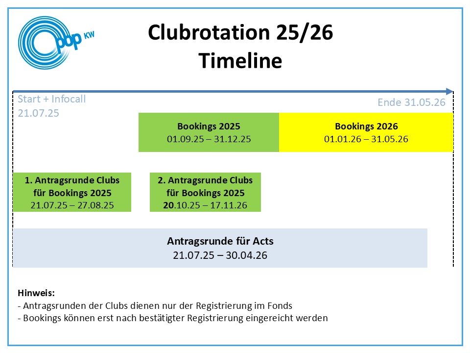 WICHTIG: Jeder Auftritt muss seitens PopKW (Projektleitung Clubgagenfonds) via E-Mail freigegeben werden.