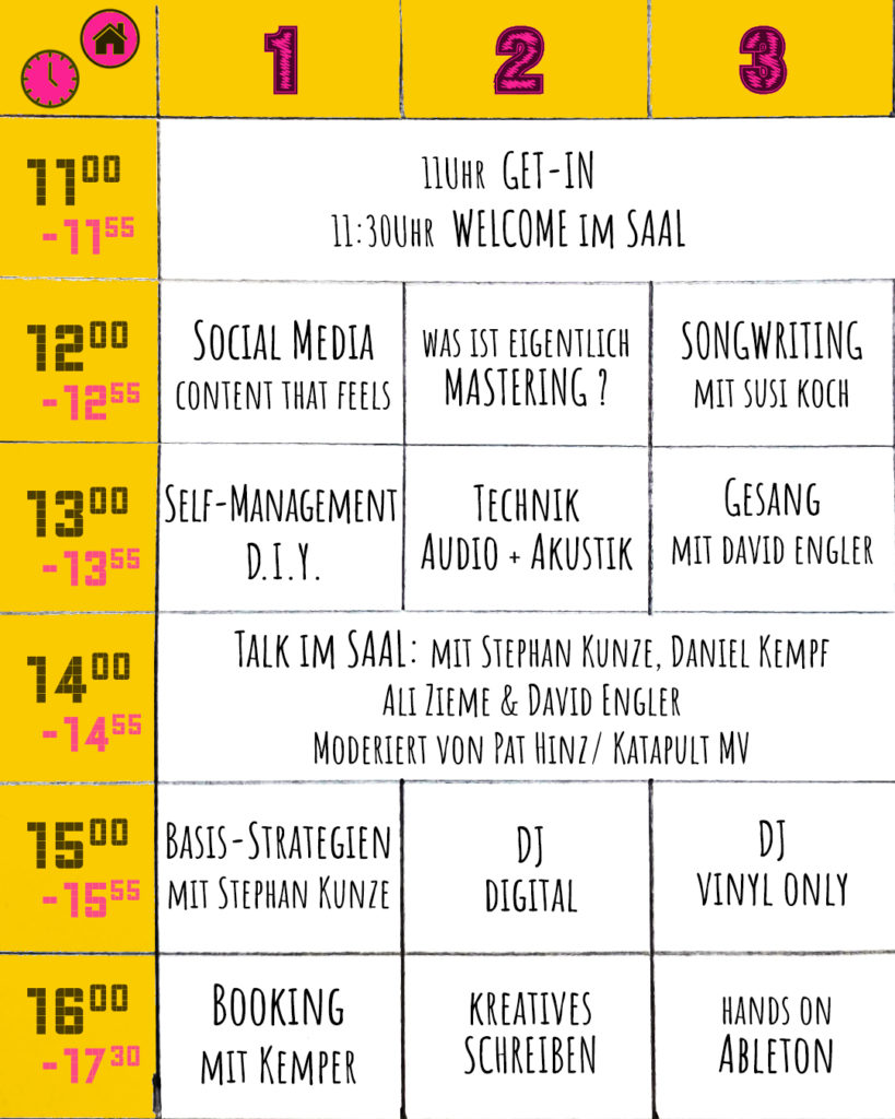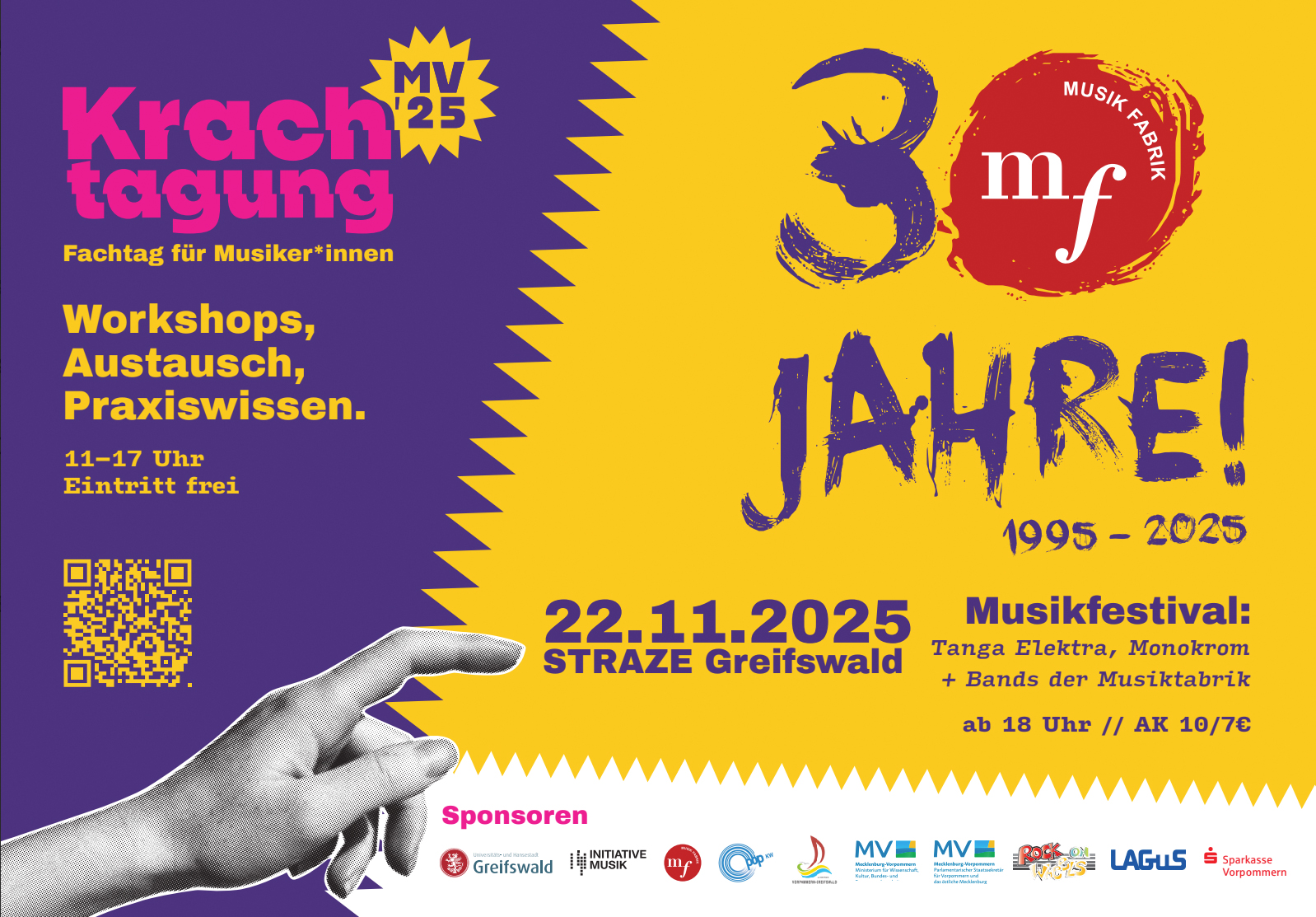 In den hellen Räumen der Straze trifft sich die Musikszene MV für einen intensiven Tag (11-17 Uhr) voller Workshops, Gespräche, Impulse und Wissenstransfer. Im Anschluss präsentiert die Musikfabrik Greifswald ab 18 Uhr ein buntes Konzertprogramm.